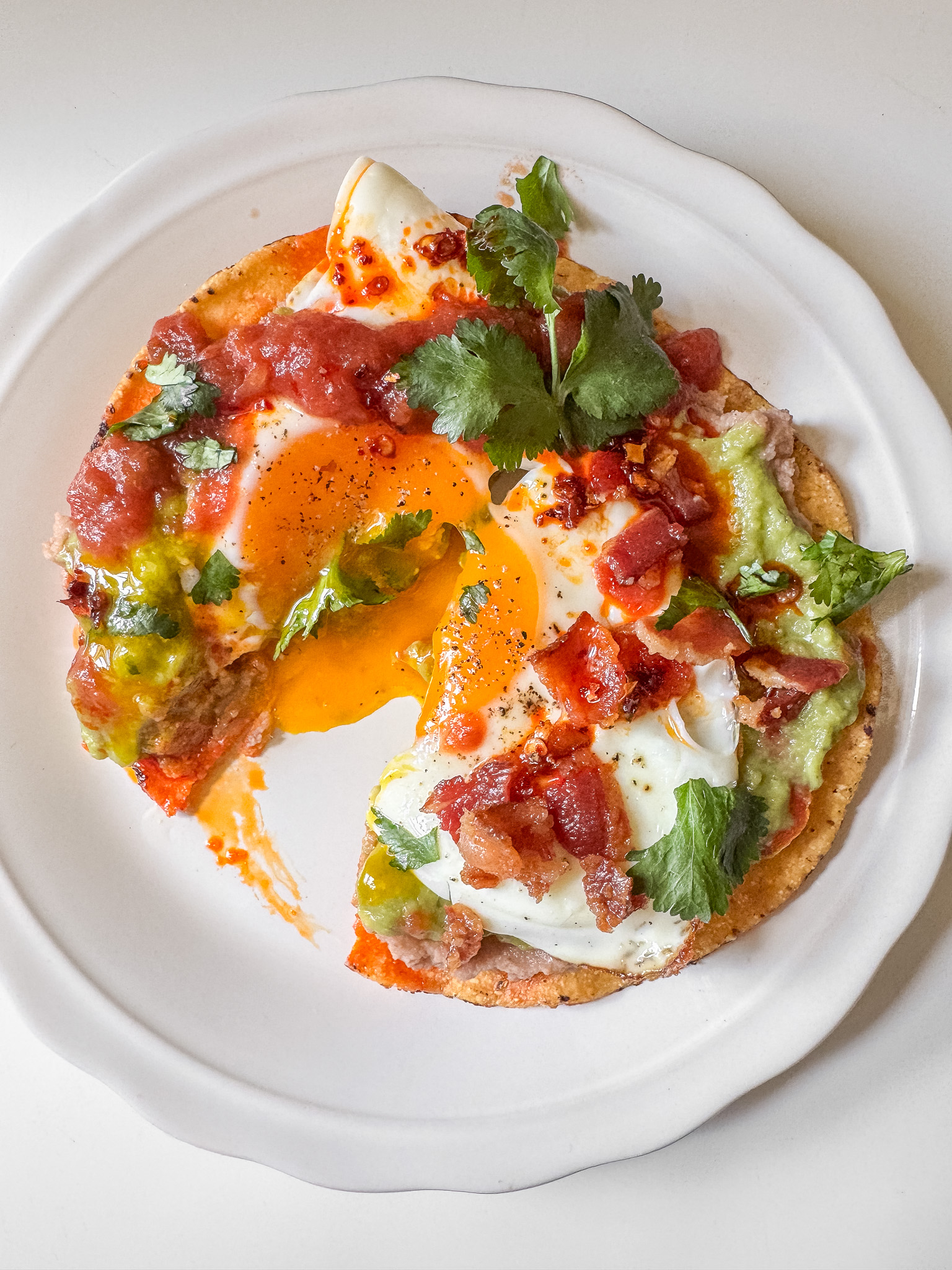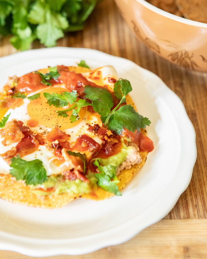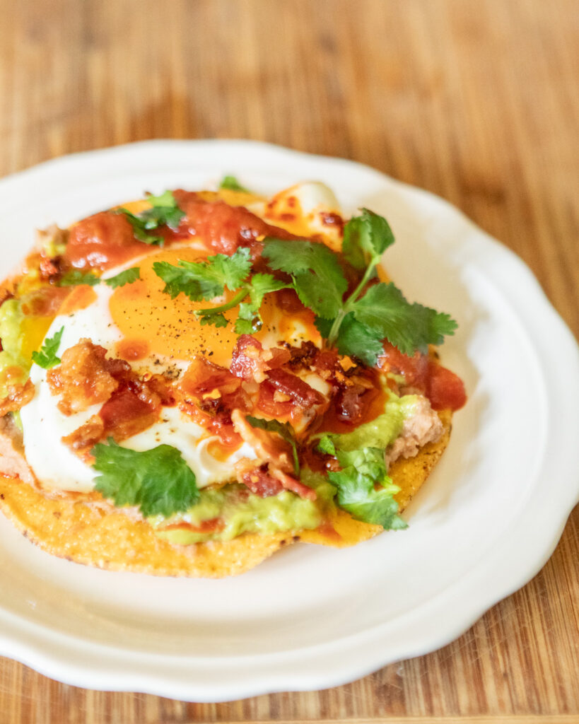 At the heart of this recipe are three stars: crispy corn tostadas, creamy refried beans, and eggs cooked just the way you like them. From there, you can keep it classic with guacamole and salsa, or dress things up with crumbled bacon, queso fresco, and even a drizzle of chili crisp for spice. Fresh cilantro, lime wedges, and diced tomato or avocado bring brightness and color.