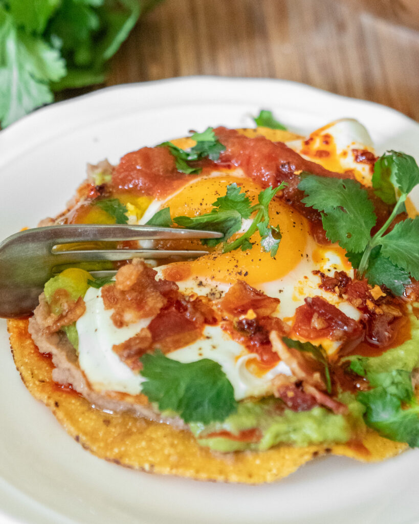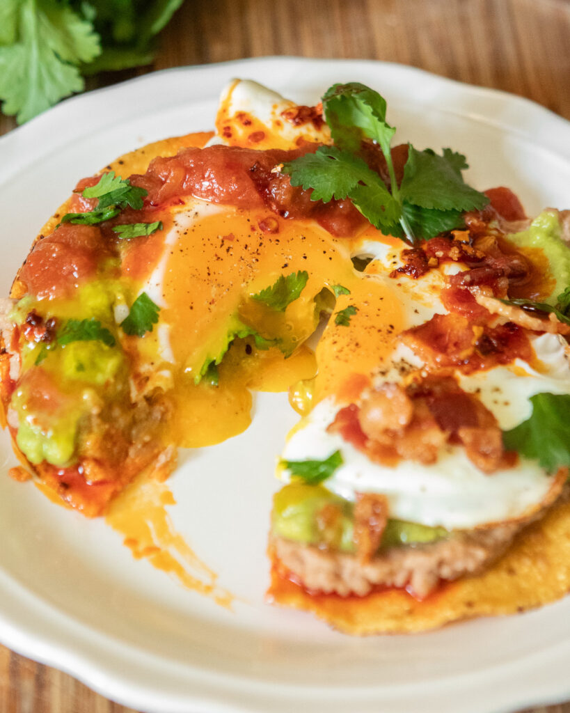 These tostadas check every box. They’re filling thanks to the protein from eggs, beans, and (if you like) bacon. The flavor layers hit all the notes — creamy beans, rich egg yolk, tangy salsa, and bright lime juice. And the whole thing comes together quickly, which means you can actually pull them off on a busy morning or make them the centerpiece of a laid-back weekend brunch.